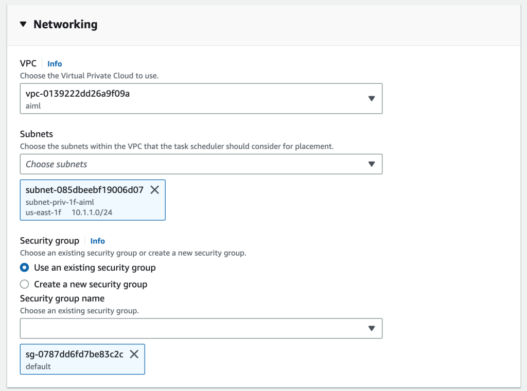 - In the Networking section, specify the VPC created by the CloudFormation stack, subnet, and security group.