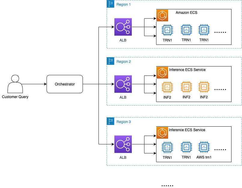 To make sure Rufus was best positioned for Prime Day, the Rufus team built a heterogeneous inference system using multiple AWS Regions powered by Inferentia2 and Trainium. Building a system across multiple Regions allowed Rufus to benefit in two key areas. First, it provided additional capacity that could be used during times of high demand, and second, it improved the overall resiliency of the system.