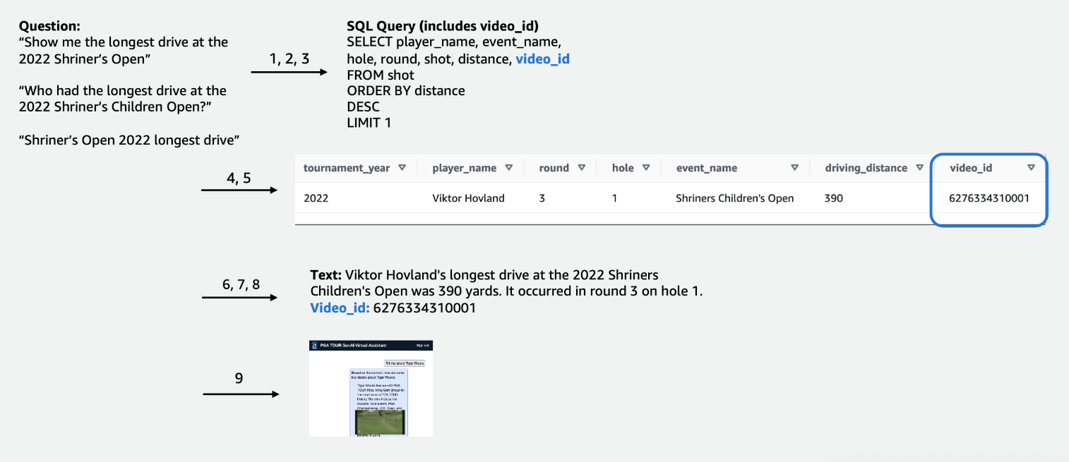 Our virtual assistant can field a wide range of questions about PGA TOUR events, players, statistics, history, and more. For example, when asked about Tony Finau’s longest drives at the Shriners Children’s Open (one of the Signature events of the PGA TOUR), the assistant can query structured data to pull his shot level data. It can extract the exact distance in yards, the round number and the hole during which he achieved this record using the text-to-SQL pipeline. The assistant then interprets this numerical data to generate a final response. The following table contains some example responses.
