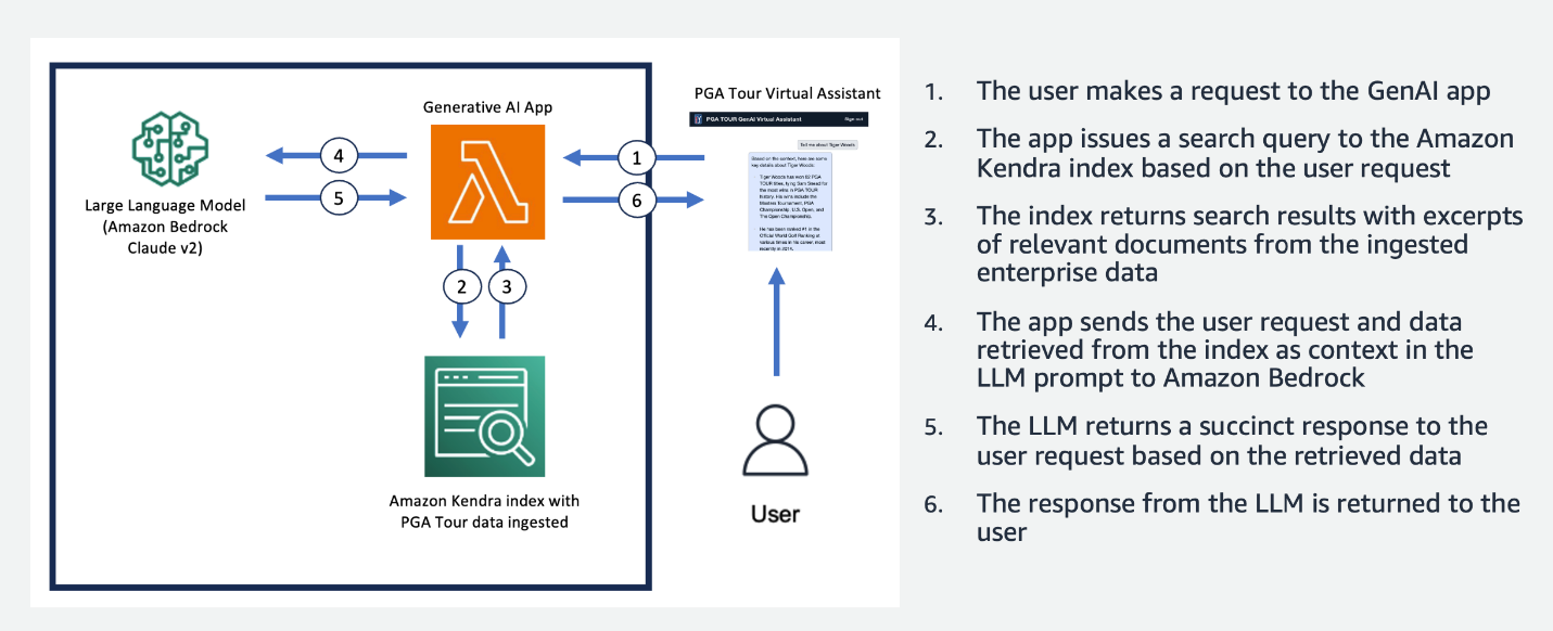 In this post we highlight how the AWS Generative AI Innovation Center collaborated with the AWS Professional Services and PGA TOUR to develop a prototype virtual assistant using Amazon Bedrock that could enable fans to extract information about any event, player, hole or shot level details in a seamless interactive manner. Amazon Bedrock is a fully managed service that offers a choice of high-performing foundation models (FMs) from leading AI companies like AI21 Labs, Anthropic, Cohere, Meta, Mistral AI, Stability AI, and Amazon via a single API, along with a broad set of capabilities you need to build generative AI applications with security, privacy, and responsible AI.