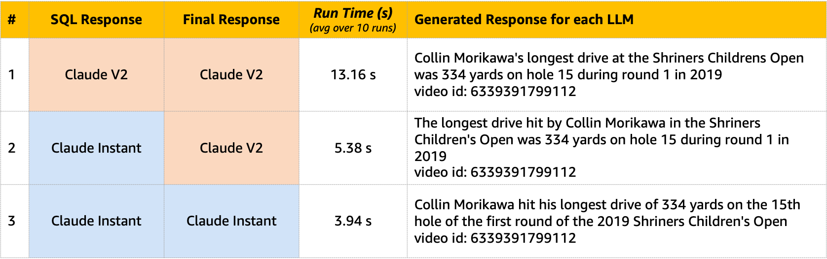Latency is often a concern with generative AI applications, and it is also the case here. It is especially a concern for text-to-SQL, which requires an initial SQL generation LLM invocation, followed by a response generation LLM invocation. If we’re using a large LLM, such as Anthropic’s Claude V2, this effectively doubles the latency of just one LLM invocation. We experimented with several configurations of large and smaller LLMs to evaluate run time as well as correctness. The following table shows an example for one question is shown below that demonstrates the latency, as well as the generated responses with Anthropic’s Claude V2 and Claude Instant on Amazon Bedrock.