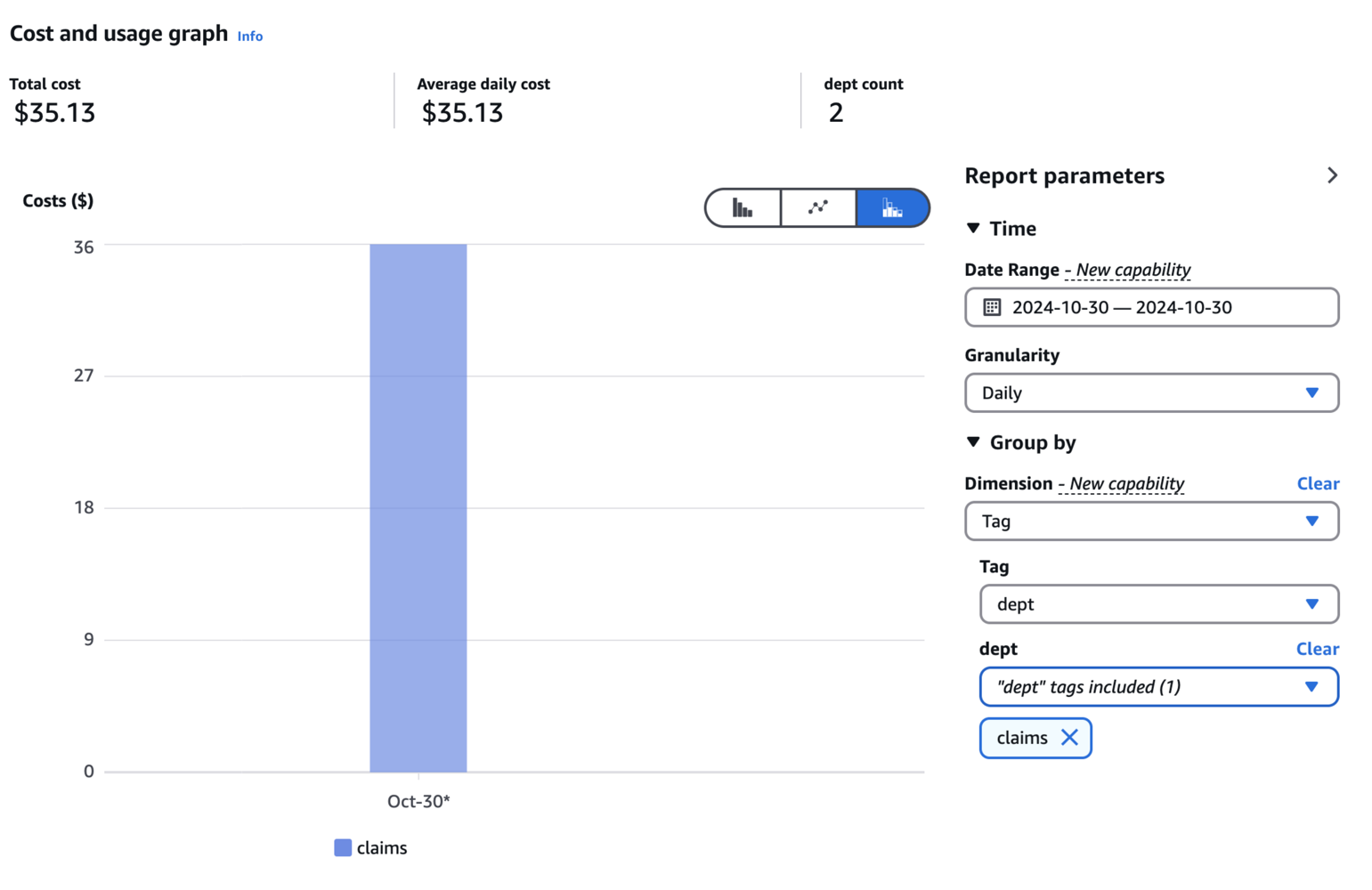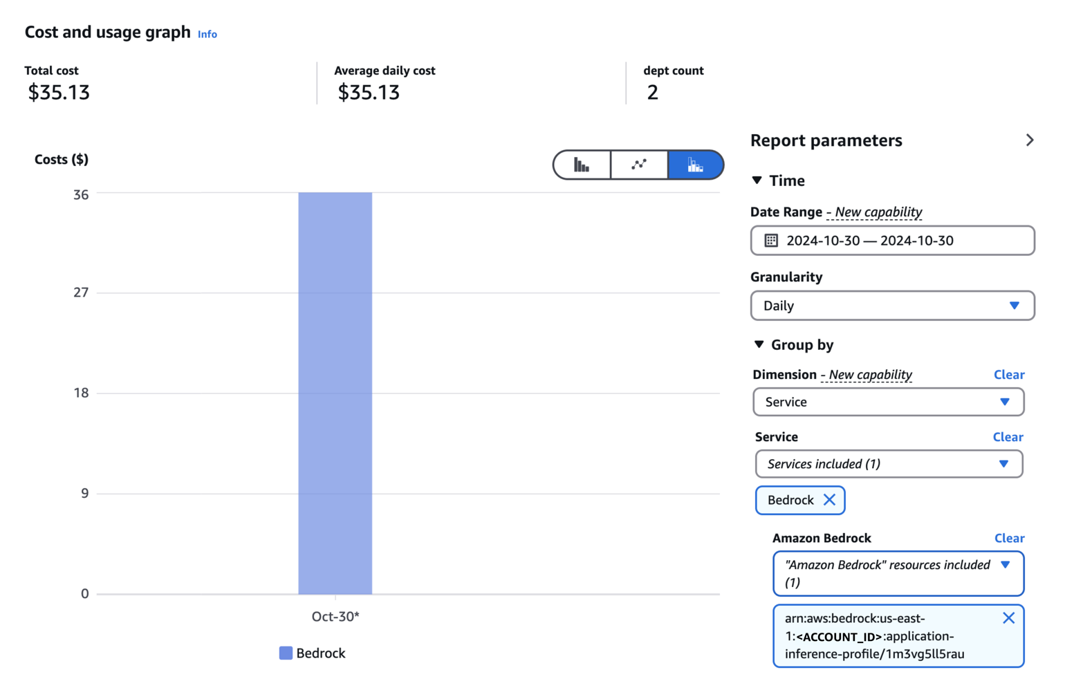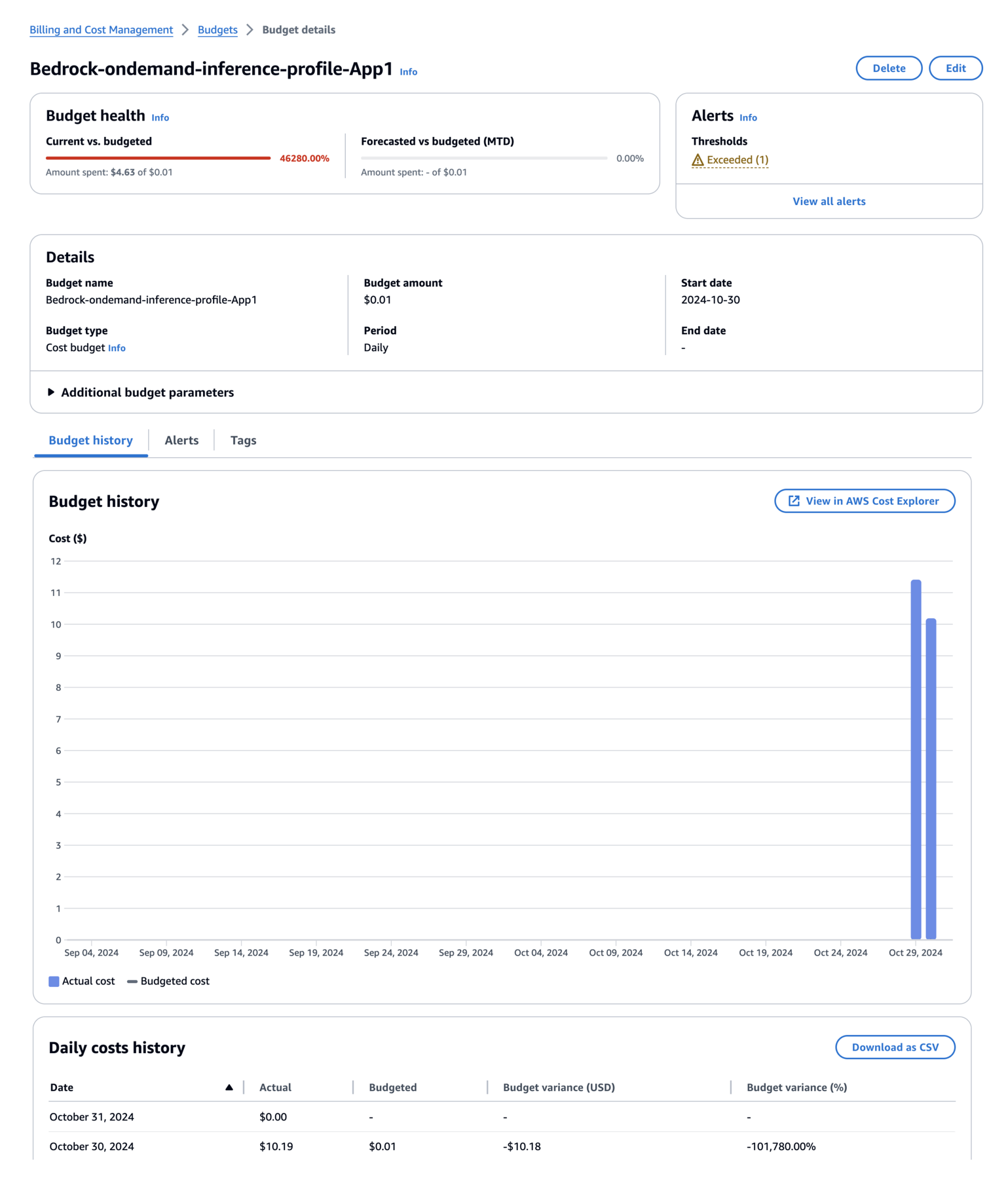 With AWS Budgets, organization can set tag-based thresholds and receive alerts as spending approach budget limits, offering a proactive approach to maintaining control over AI resource costs and quickly addressing any unexpected surges. For example, a $1,000 per month budget could be applied on a specific chatbot application for the Support Team in the Sales Department by applying the following tags to the application inference profile: dept:sales