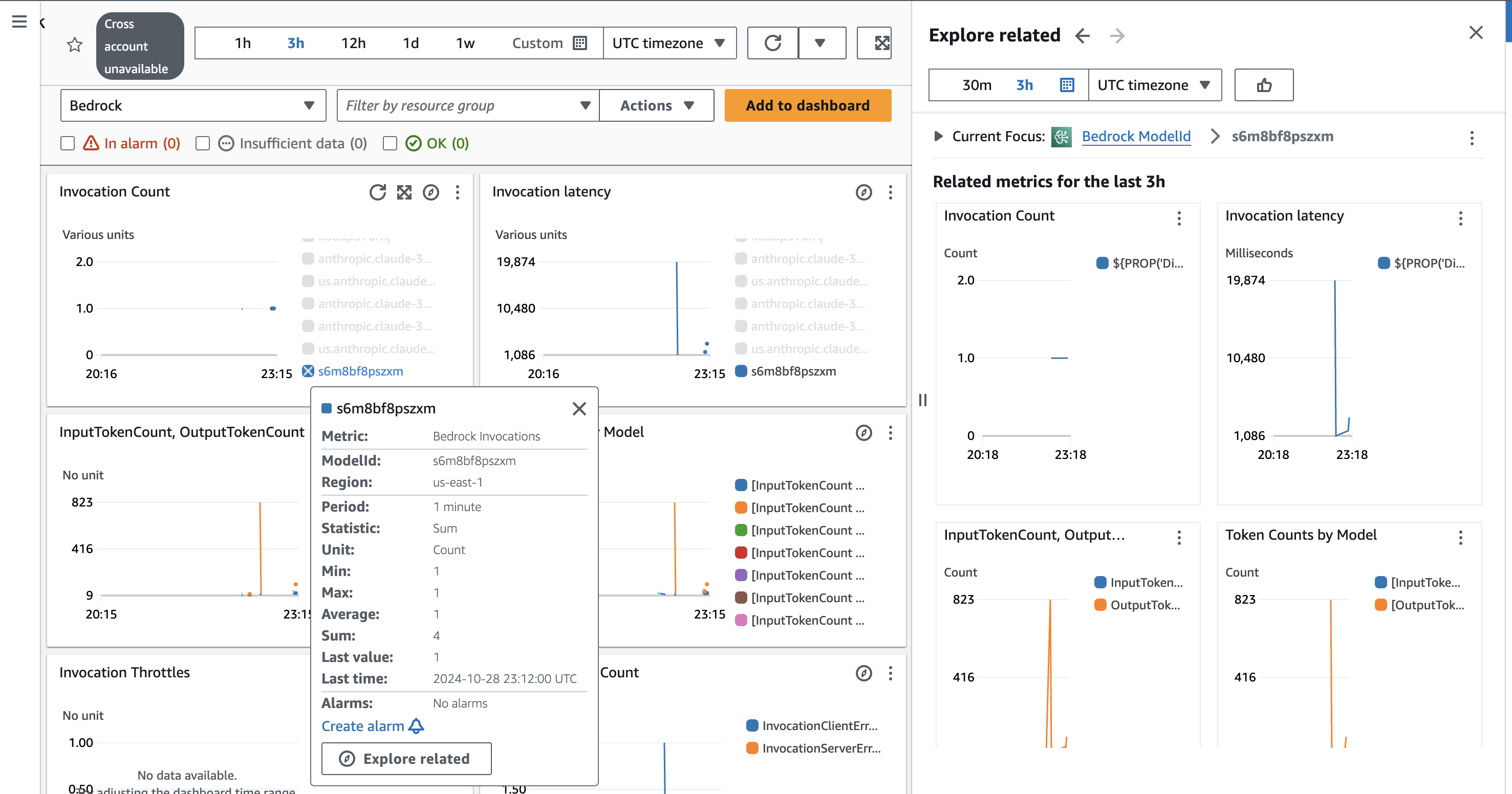 The following Amazon CloudWatch console screenshot highlights Bedrock runtime metrics filtered by Bedrock application inference profile ARN: