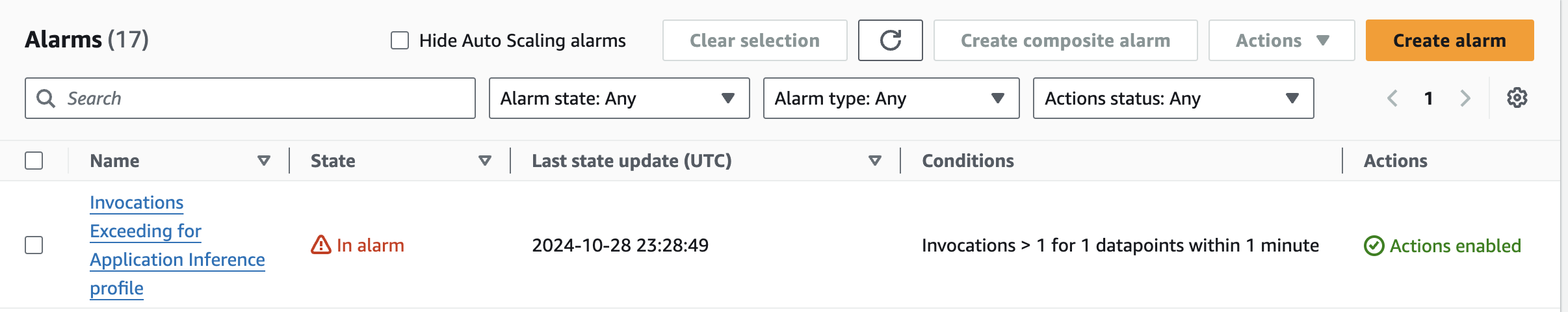 The following Amazon CloudWatch console screenshot highlights an invocation limit alarm filtered by Bedrock application inference profile ARN: