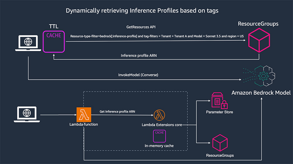 The architecture in the preceding figure illustrates two methods for dynamically retrieving inference profile ARNs based on tags. Let’s describe both approaches with their pros and cons: