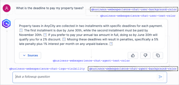 Amazon Q Business allows extensive customization of the web experience to align with your agency’s visual identity. The default interface includes several elements that can be modified to match your organization’s branding requirements.