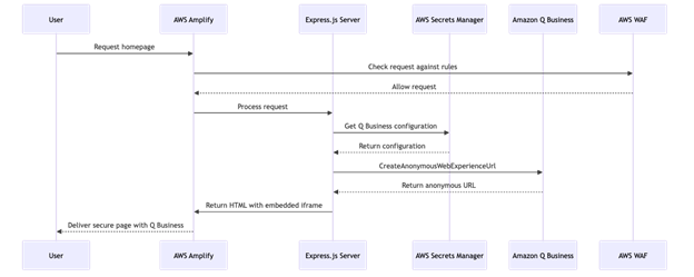 Figure 10. Sequence diagram showing request flow between user browser, AWS Amplify, AWS Secrets Manager, and Amazon Q Business API.