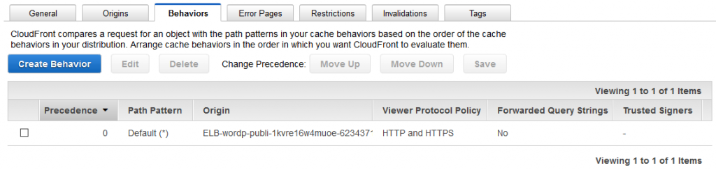 Once you create the distribution you will be redirected back to the CloudFront web console, where you can see your distribution listed with a status of “In Progress”. It may take several minutes for the status to change to Deployed, but we can continue to specify Origins and Behaviors for the WordPress content.