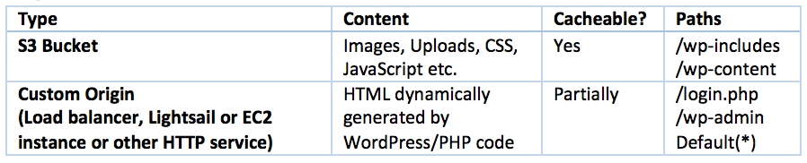 Even a relatively simple website may serve content from separate locations. CloudFront refers to these separate locations as origins. An origin can be either an Amazon S3 bucket or an HTTP endpoint. Your HTTP servers can be hosted on AWS or any Internet-facing HTTP system. In the diagram above S3 and the WordPress servers would be configured as separate origins in your distribution settings.