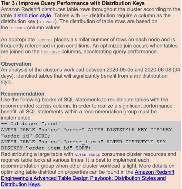 Advisor analyzes your cluster’s workload to identify the most appropriate distribution key for the tables that can significantly benefit from a KEY distribution style. Advisor provides ALTER TABLE statements that alter the DISTSTYLE and DISTKEY of a table based on its analysis. To realize a significant performance benefit, make sure to implement all SQL statements within a recommendation group.