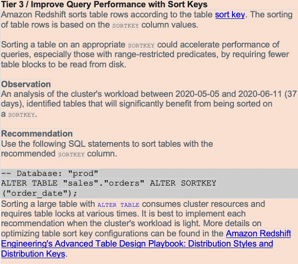 Advisor analyzes your cluster’s workload over several days to identify a beneficial sort key for your tables. See the following screenshot.