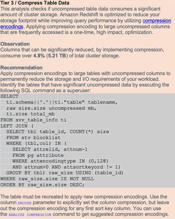 The following screenshot shows an example of table compression recommendation.