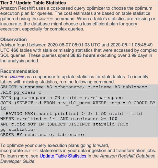 Maintaining current statistics helps complex queries run in the shortest possible time. The Advisor analysis tracks tables whose statistics are out-of-date or missing. It reviews table access metadata associated with complex queries. If tables that are frequently accessed with complex patterns are missing statistics, Amazon Redshift Advisor creates a critical recommendation to run ANALYZE. If tables that are frequently accessed with complex patterns have out-of-date statistics, Advisor creates a suggested recommendation to run ANALYZE.