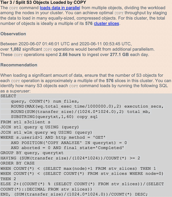 Another script in the amazon-redshift-utils GitHub repo, CopyPerformance, calculates statistics for each load. Amazon Redshift Advisor also warns of missing compression or too few files based on the number of slices (see the following screenshot):