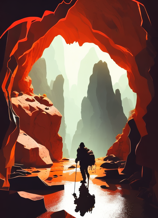 battered hiker in a wondrous cave, gloomy, mysterious, incredible, vector art, chiaroscuro, thick lines, wavy, volumetric lighting, studio quality, sharp focus, detailed