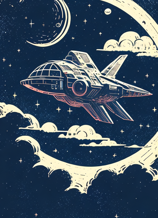 glowing futuristic military spaceship flying in front of a celestial moon in outer space, quiet, cozy, pretty, stunning, anime, splatter paint style, linocut, vintage, professional, raytracing, studio quality, UHD