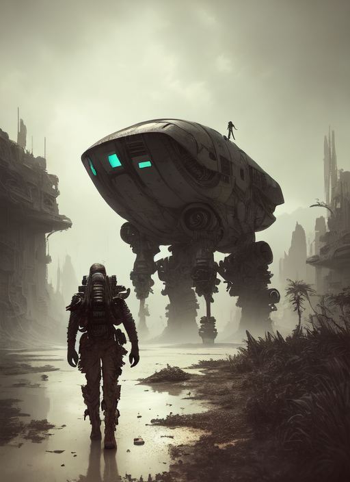 futuristic explorer walking on an abandoned planet, lush, post-apocalyptic, tonal colors, ink, portrait, realistic, UHD, trending on artstation, highres