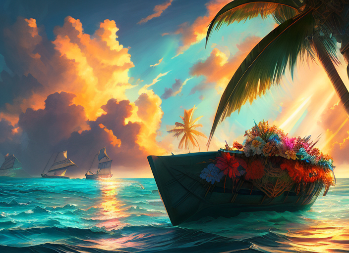 floral rowboat in the Caribbean Sea, magnificent, ominous, breathtaking, terrifying, cyberpunk, digital painting, sun rays, color page, realistic, HQ, professional, raytracing