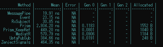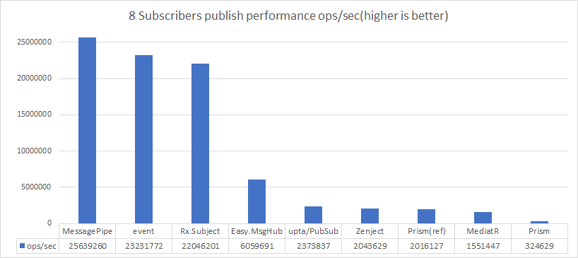 MessagePipe is faster than standard C# event and 78 times faster than Prism's EventAggregator.