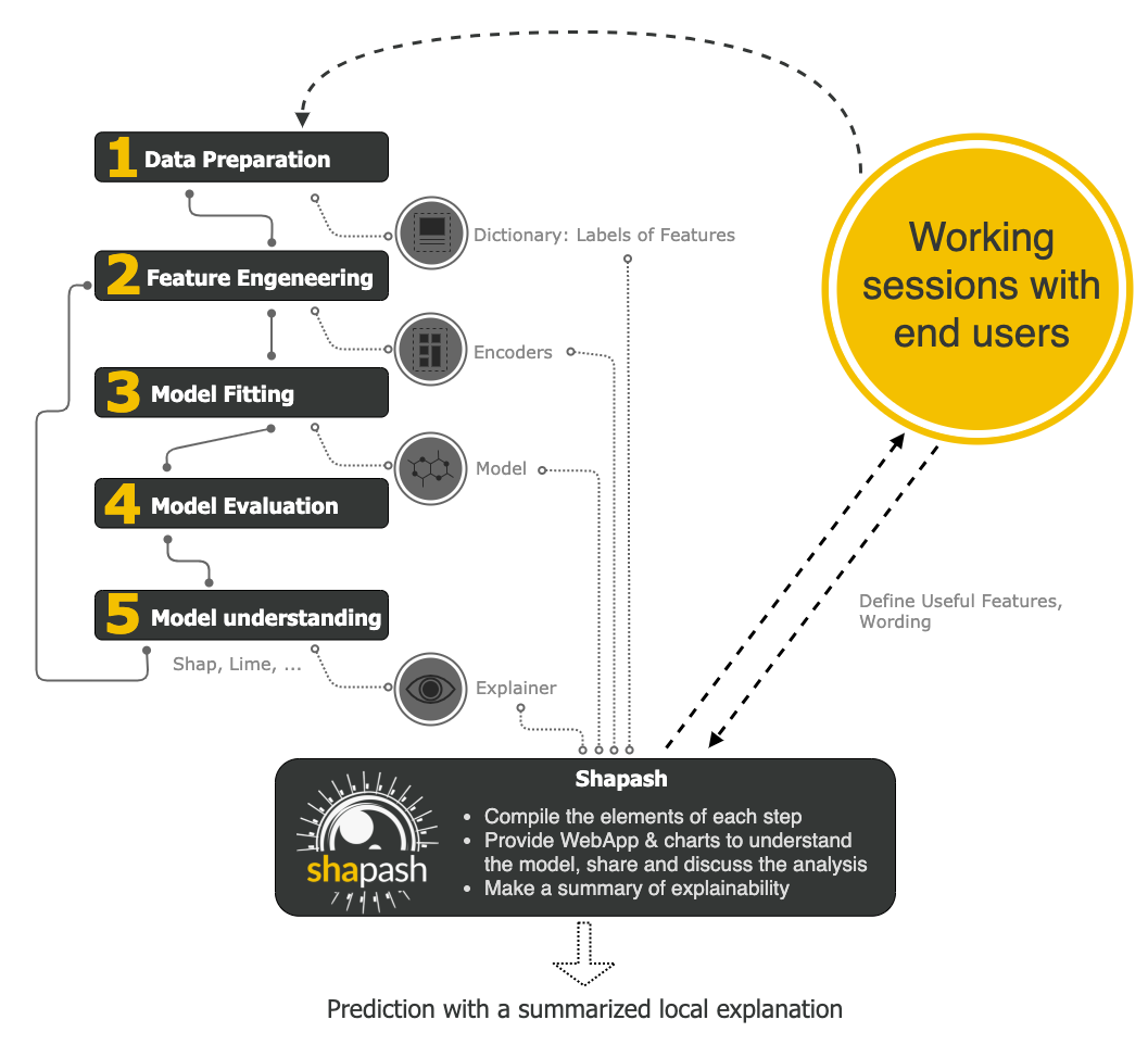 Shapash is an overlay package for libraries focused on model interpretability. It uses Shap or Lime backend to compute contributions. Shapash builds upon the various steps required to create a machine learning model, making the results more understandable.