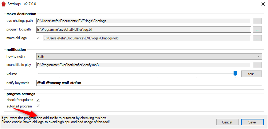You can change some general properties by modifying the EveChatNotifier.exe.config inside the folder of the program itself. Keep in mind, that all properties are only loaded on program start. So you have to restart if you made changes to this file.