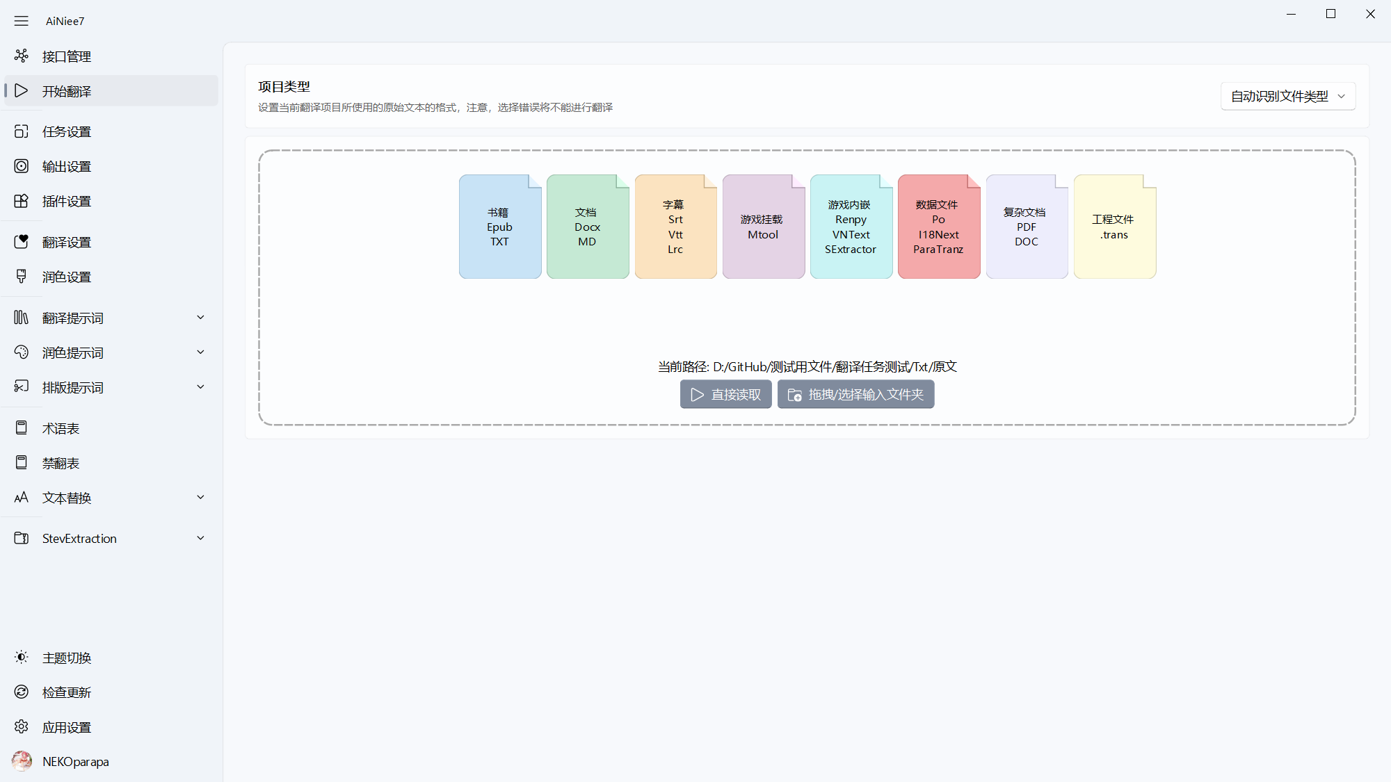 - 输入文件夹:将原文文件单独放置新的文件夹,并将该文件夹拖入框内。小说、字幕、文档可直接进行翻译,游戏需要文本提取工具进行配合。