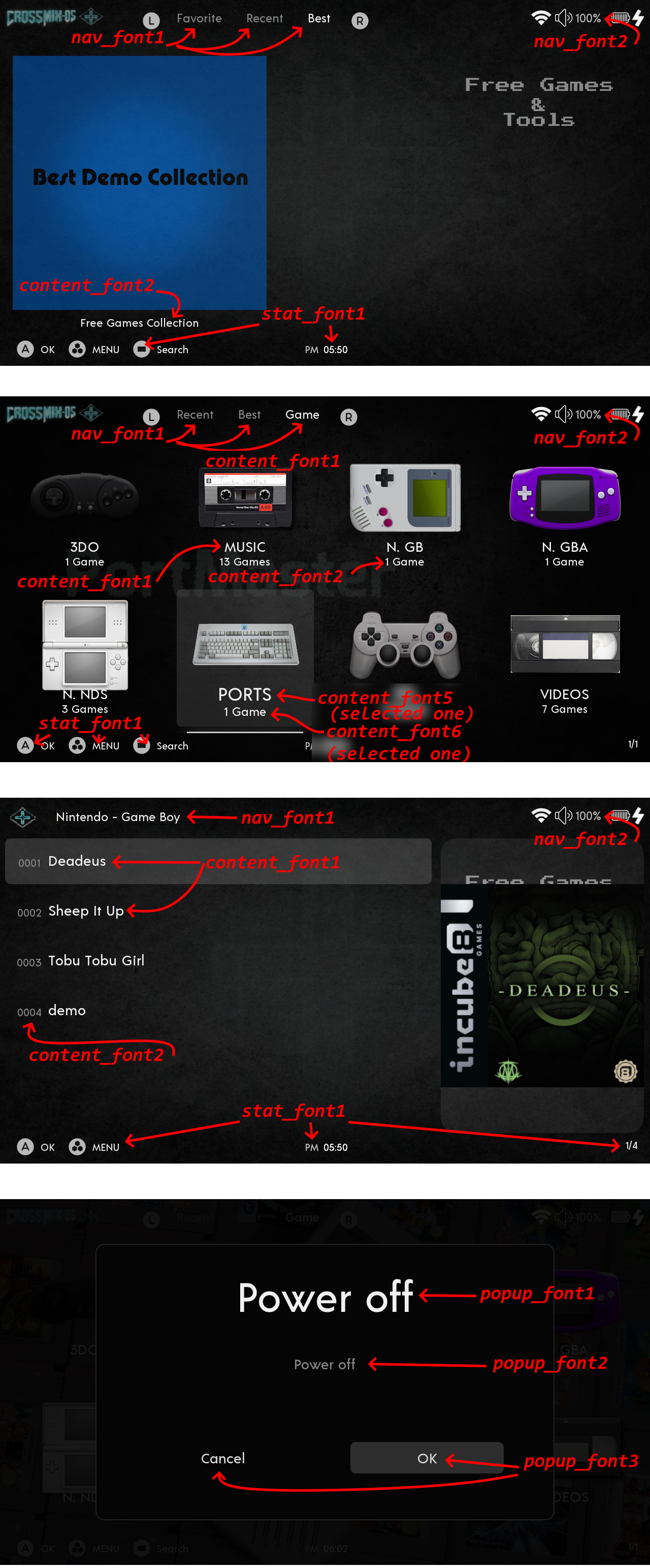 Theme Packs are very easy to create: just create a new .sh file into SDCARD/Apps/SystemTools/Menu/THEME##THEME PACK SELECTOR/ with the variables mentioned below.