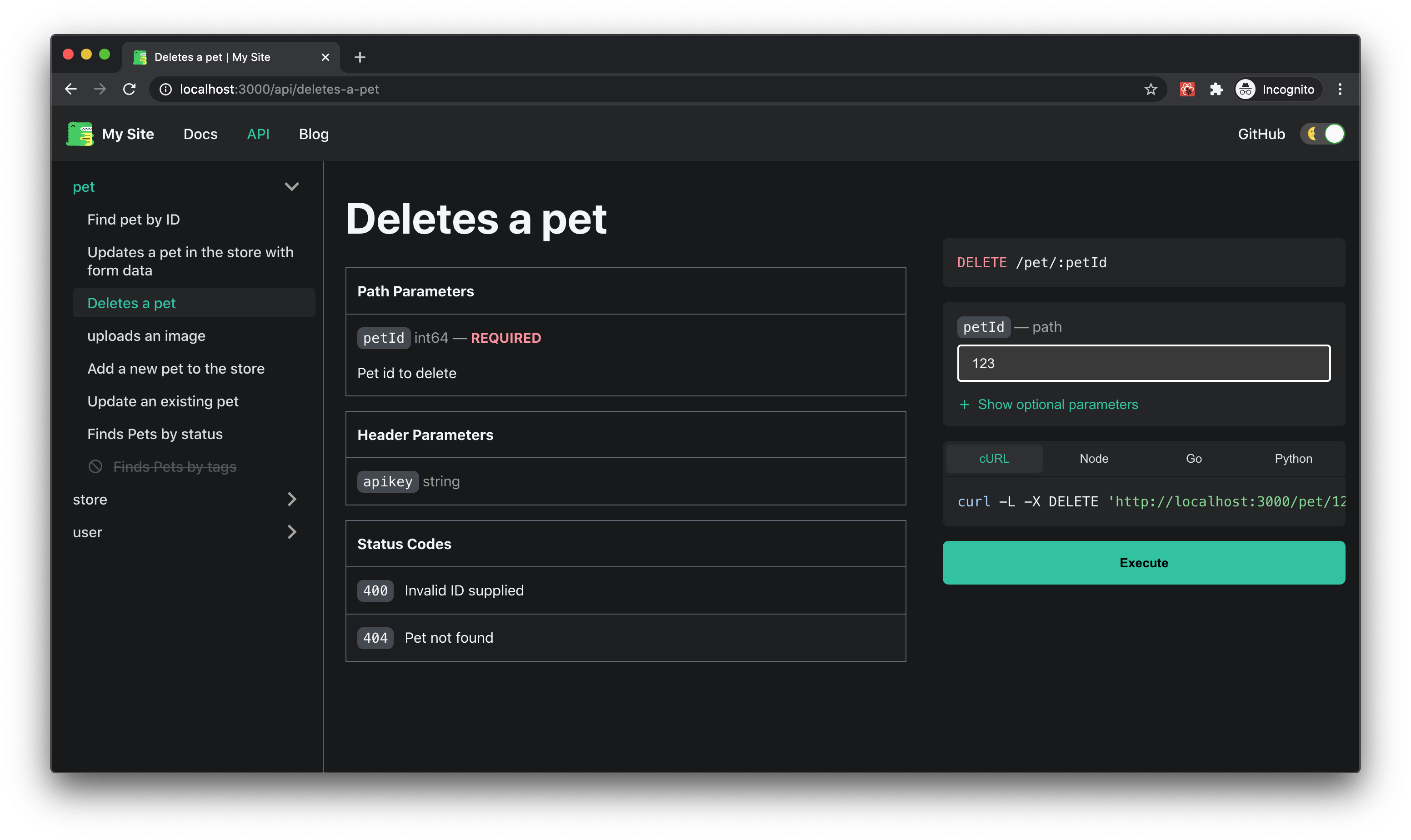 docusaurus.config.jsfile to use this presetpresets: [ [ "docusaurus-preset-openapi", /** @type {import('docusaurus-preset-openapi').Options} */ { api: { path: "<PATH_TO_YOUR_OPENAPI_DOCUMENT>", routeBasePath: "/api", }, docs: { sidebarPath: require.resolve("./sidebars.js"), routeBasePath: "/", }, theme: { customCss: require.resolve("./src/css/custom.css"), }, }, ], ];