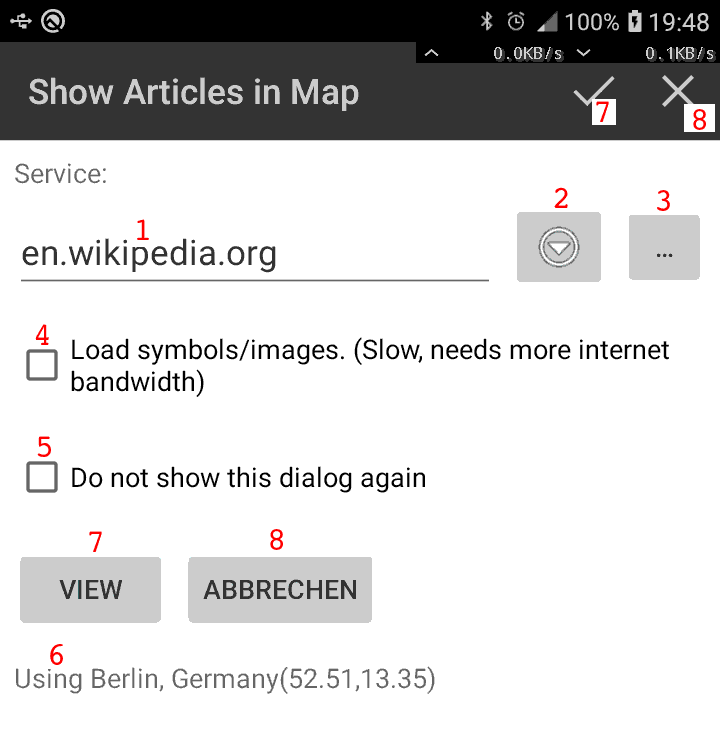 - (1) shows the current service "en.wikipedia.org" where the geo-data is taken from. You can