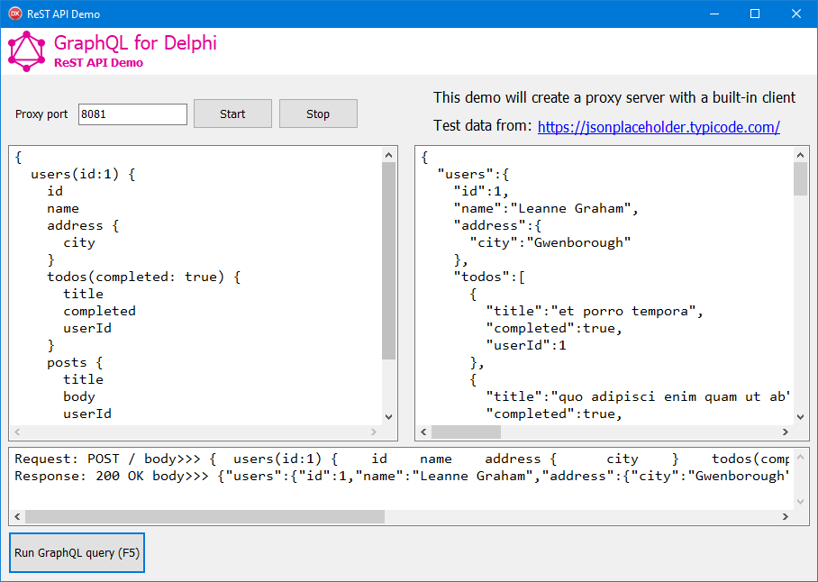 If you need to use GraphQL to queries a ReST API you can see the ProxyDemo. This simple project creates a basic HTTP server that responds to GraphQL query and uses a remote ReST API (https://jsonplaceholder.typicode.com/) as a data source.