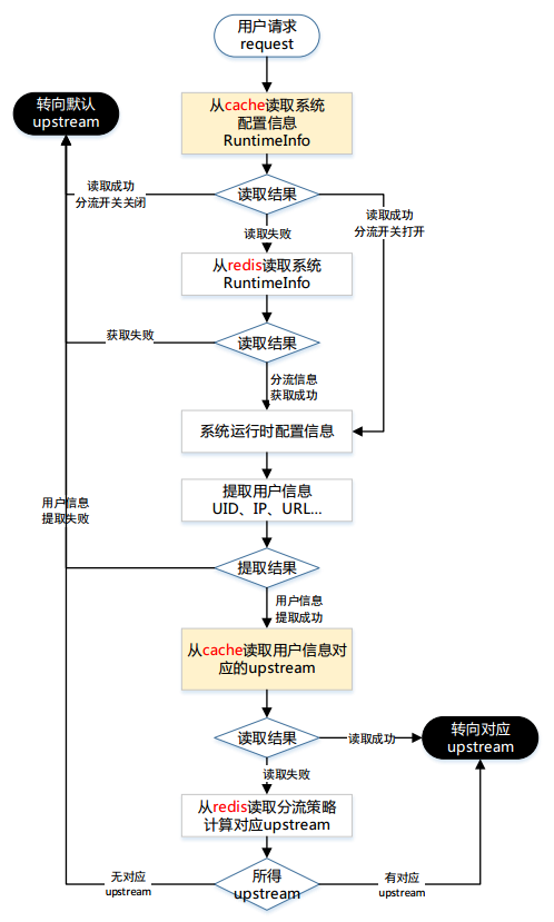 - 系统对用户请求进行分流时,首先获得系统 `运行时信息runtimeInfo` 中的信息,然后提取 `用户特征userInfo`,最后 `分流模块divModule` 根据 `分流策略dviDataKey` 和 `用户特征userInfo` 查找出应该转发到的upstream。如果没有对应的upstream,则将该请求转向默认upstream。