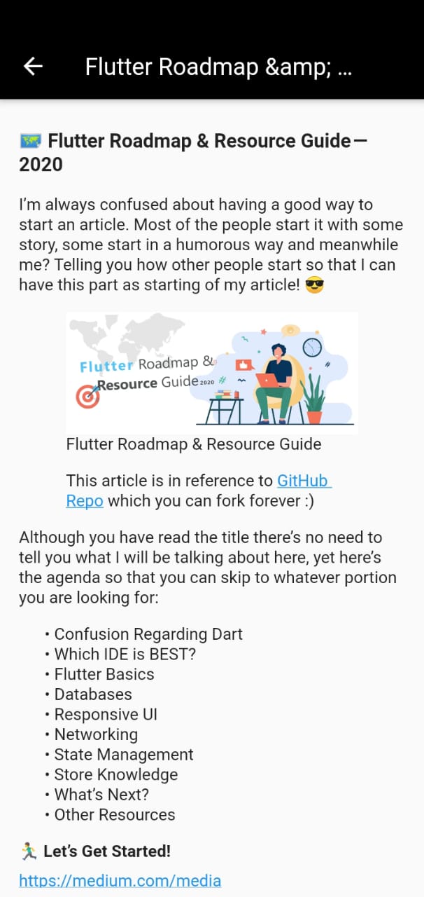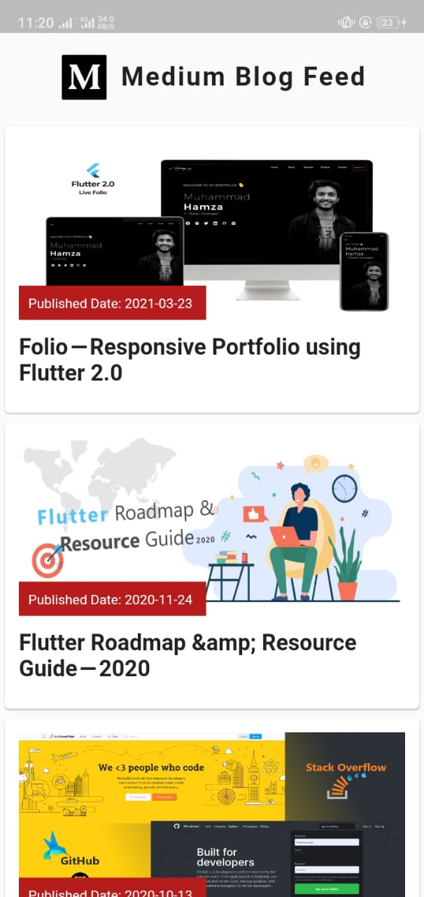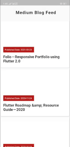 Its a Flutter app with integration of Medium Blog Feed using RSS2Json API end point. Written medium article for furhter details :)