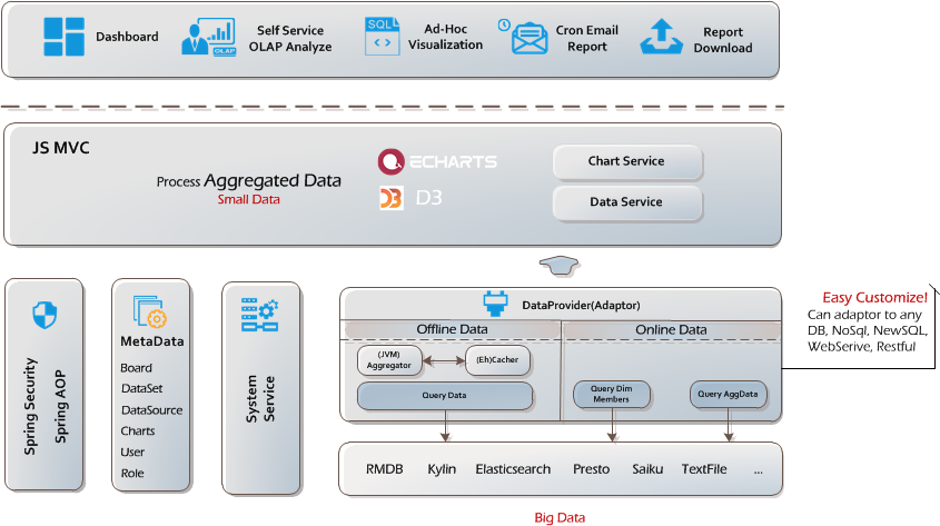 - Easy to implement your own DataProvider to connect any data source. Even for expensive commercial BI suite, it's not possible to connect all the NOSQL and NewSQL data source in the era of big data. Due to the schema of NOSQL are various, such as hash tables, arrays, trees, maps, etc., different people using the same NoSQL products designed Schema may vary widely. The user who most familiar with their storage schema are the user themselves. And it's easy to find a Java programmers to code a Class to connect their own data source. So we leave this part of work to the end user with an easy extended data connection framework in CBoard