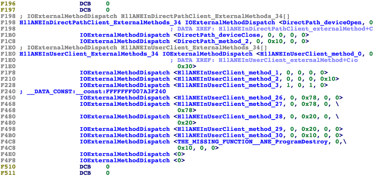 Oddly, the external method tables for both H11ANEInDirectPathClient and H11ANEInUserClient had defined symbols. This was weird: I had expected the code would consist of a single array of IOExternalMethodDispatch structs, so that H11ANEInDirectPathClient could claim the 34 methods starting at index 0 while H11ANEInUserClient could claim the 34 methods starting at index 3. In such an arrangement, there should only be one symbol, that for the array as a whole.