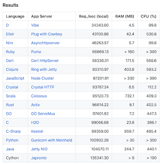 It's interesting to see the memory usage of those language-framework, also Crystal, despite inability to utilize multicore still could perform as good as Golang's default muxer (which is not the best).