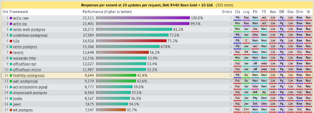Top rankers for this time is Rust, Java, C, C#, Go, and C++, the rest has some error or ranked lower than that. Here's some result of multiple queries benchmark: