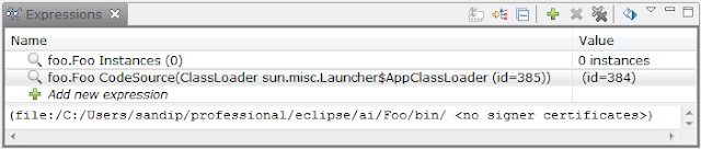 Once you selects the class it adds the <Java Class> Instances expression to the Expressions view. Please note that instances of sub classes are also shown if the Show instances of subclasses checkbox is selected. For example, when java.io.OutputStream is selected it shows the instances of it's subclasses also. You can further filter out inner and anonymous inner classes using the additional check boxes. This functionality is not provided by Eclipse Java debugger's All Instances... action.
