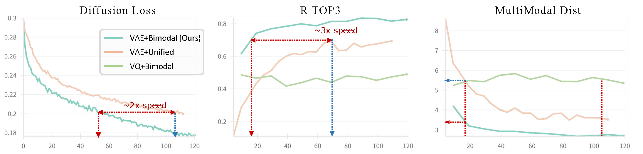 Comparison on different model settings of continuous/ discrete representation, and unified model/ bimodal architecture (Ours) on motion generation of validation set. Our hybrid language-motion architecture with continuous motion representation helps accelerate training for about 2x, as well as achieves better quality.