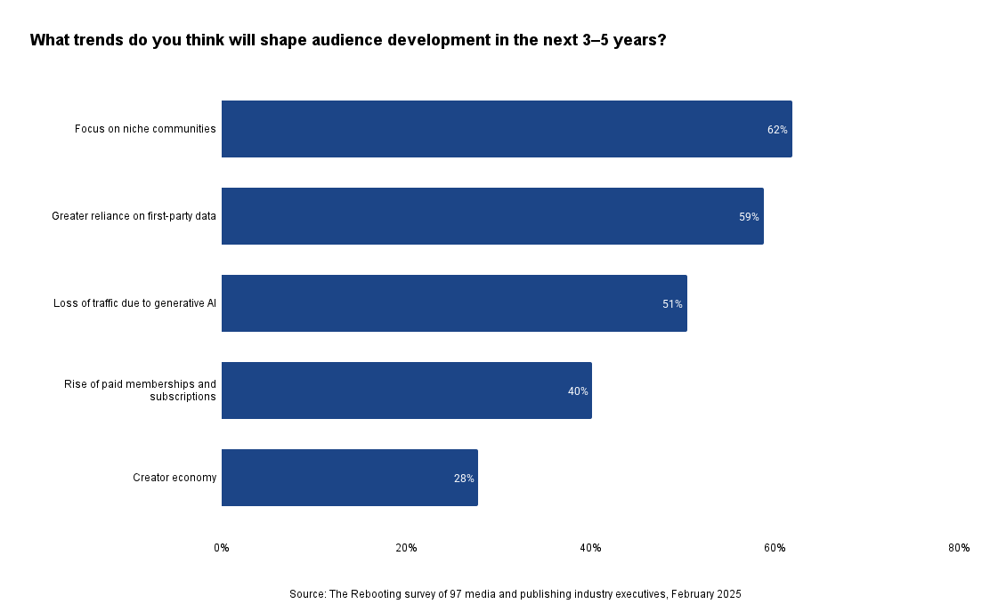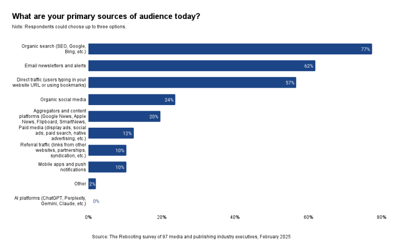 - Newsletters (62%) and direct traffic (57%) are increasingly seen as the backbone of audience growth.
