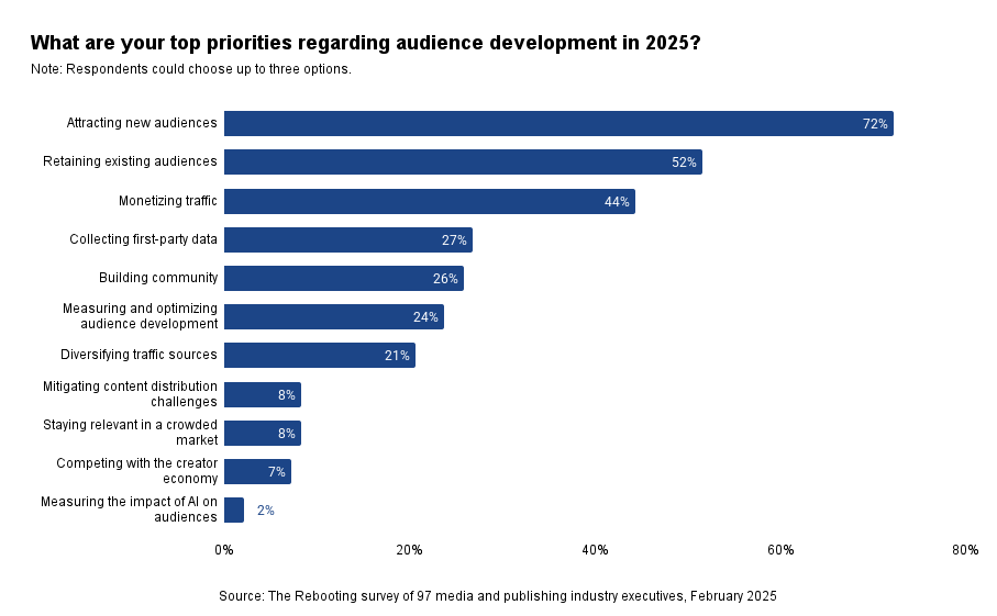 Yet even as publishers are in the midst of realigning their business, they must continue to operate the existing business. The top audience development goal for publishers in 2025 is to increase traffic, our survey found. At the same time, publishers are also doing more to boost the depth of engagement with their audiences.