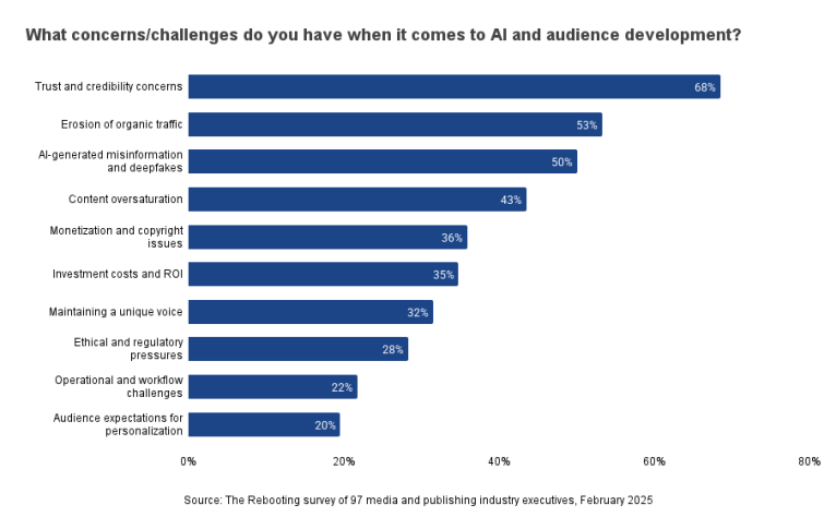 Publishers also worry about the potential negative effects of AI on content. Their top concern was the impact on trust and credibility (68%), while the potential for AI-generated misinformation and fakes (50%) ranked third.