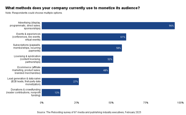 The Rebooting surveyed 97 publishing/media company executives in February 2025. Half of the respondents represent companies that target consumers, 19% target a B2B audience and 31% target both. Two-thirds work for companies with a monthly audience of 1 million or greater, and one-third have a monthly audience of 1 million or less.