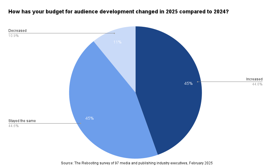 Audience development budgets are rising. Nearly half of respondents (45%) said their company is increasing the budget for audience development this year. Only 11% are decreasing the budget.