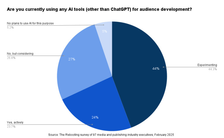 Many publishers are leaning on generative AI to assist audience development efforts. More than two-thirds (68%) of respondents said their companies are actively using or experimenting with AI (other than ChatGPT) for this purpose.