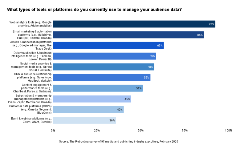 To better understand how media companies are driving audience growth and engagement, The Rebooting conducted a survey of 97 media and publishing industry executives. The survey also explored the impact of AI on audience development and the audience management platforms that media companies are using to make it easier to put their data to work. The survey was complemented with stakeholder interviews with executives at leading publishing companies.