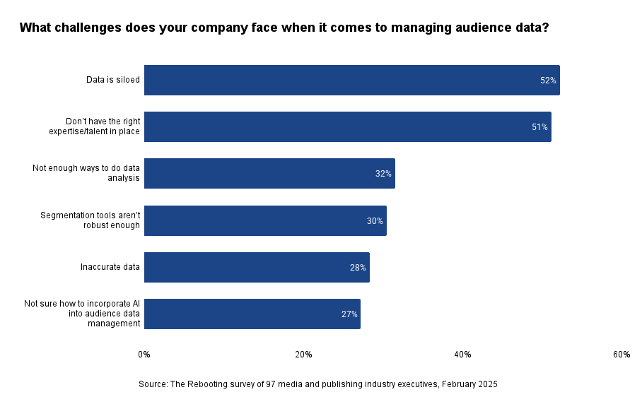 Siloes and talent shortcomings are the biggest audience data management challenges. 52% cited the perennial problem of data silos, while 51% mentioned having the right staff or talent in place. “We have a vast set of ways our audience can engage with us, and sometimes our data gets so granular that it turns to dust,” one survey taker reported. “A lot of times, no clear strategy comes from it.”