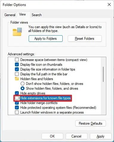 3. Click the View tab and, under the "Advanced settings" section, clear the Hide extensions for known file types option.